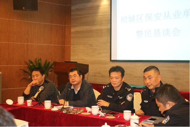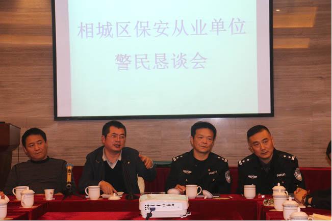 2015年11月19日14:30在江蘇康平保安公司會(huì)議室舉行:相城區(qū)保安從業(yè)單位警民懇談會(huì),與會(huì)的有市公安局治安支隊(duì)保安監(jiān)管大隊(duì)的朱大、戴大,公安相城分局治安大隊(duì)的楊大、賀大、吳警官,還有相城區(qū)各保安行業(yè)的企業(yè),通過懇談會(huì),深刻領(lǐng)悟市局、分局領(lǐng)導(dǎo)有關(guān)指示精神!今年10月—12月省公安廳開展保安市場專項(xiàng)整治活動(dòng),公司積極做好:治安信息員、法制宣傳員、義務(wù)巡邏隊(duì)員工作,爭取完成省公安廳要求2016年6月底前所有在崗保安員必須持證上崗的指示,向兄弟單位學(xué)習(xí),不斷完善服務(wù)質(zhì)量,提高公司核心競爭力,走品牌化道路的戰(zhàn)略目標(biāo)前行!