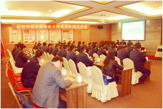 2015年12月3日,蘇州市保安服務(wù)業(yè)義務(wù)巡邏隊(duì)成立大會在江蘇康平保安服務(wù)有限公司召開。會議由蘇州市公安局治安支隊(duì)監(jiān)管大隊(duì)教導(dǎo)員陸萍主持,蘇州市公安局治安支隊(duì)副支隊(duì)長郭偉平、蘇州市公安局治安支隊(duì)監(jiān)管大隊(duì)大隊(duì)長朱永忠及蘇州市保安服務(wù)行業(yè)協(xié)會會長畢坤明出席了會議。蘇州市公安局各分局治安大隊(duì)領(lǐng)導(dǎo)及蘇州市五家保安服務(wù)有限公司巡邏員代表50余人參加了會議。